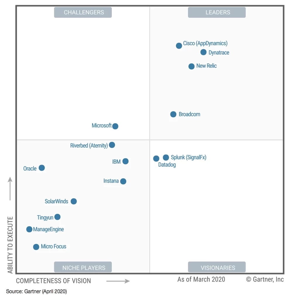 Ein Blick auf den Magic Quadrant 2020 des Marktforschungsunternehmens Gartner veranschaulicht die Marktposition der unterschiedlichen APM-Anbieter.