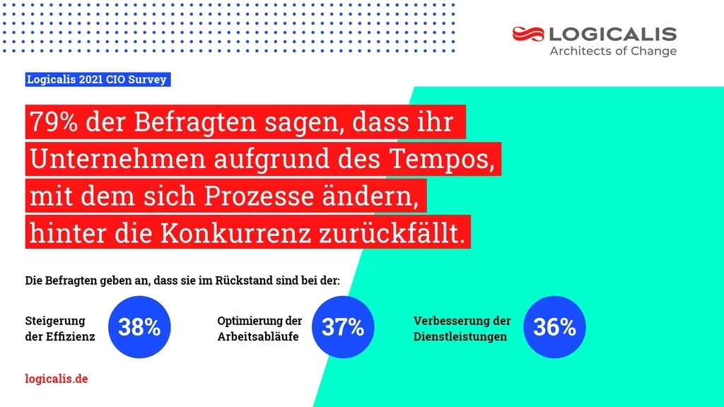 Die von Vanson Bourne durchgeführte Umfrage befragte 1.000 CIOs aus 28 Ländern, um ihre Prioritäten und Fähigkeiten in diesen unbeständigen Zeiten zu ermitteln. Die Ergebnisse zeigen, dass sich viele Unternehmen ihrer Herausforderungen bewusst sind und ihr Geschäft umgestalten wollen, aber nicht immer effektive Maßnahmen ergreifen, um ihre Ziele zu erreichen. So sind 79 % der Befragten der Meinung, dass ihr Unternehmen aufgrund des Tempos, in dem sich die Prozesse ändern, hinter die Konkurrenz zurückfällt.