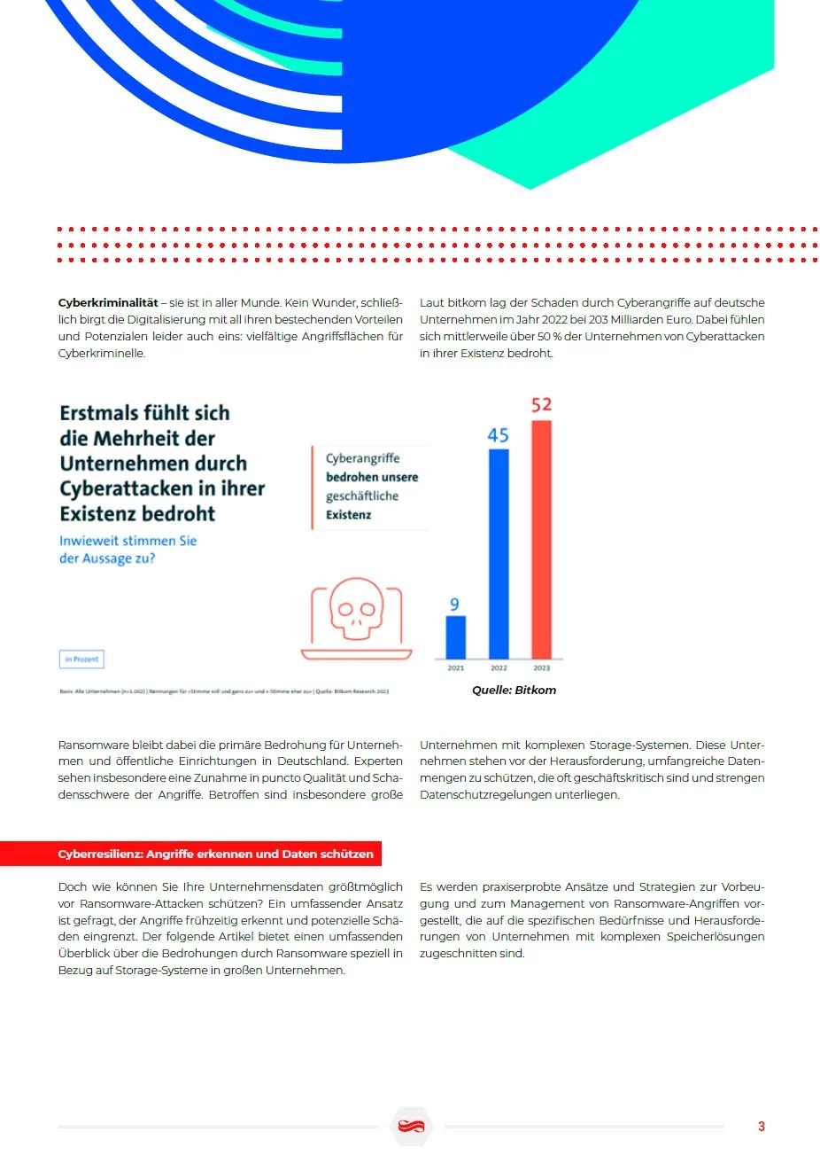 Ransomware bleibt dabei die primäre Bedrohung für Unternehmen und öffentliche Einrichtungen in Deutschland. Experten sehen insbesondere eine Zunahme in puncto Qualität und Schadensschwere der Angriffe. Betroffen sind insbesondere große Unternehmen mit komplexen Storage-Systemen. Diese Unternehmen stehen vor der Herausforderung, umfangreiche Datenmengen zu schützen, die oft geschäftskritisch sind und strengen Datenschutzregelungen unterliegen.