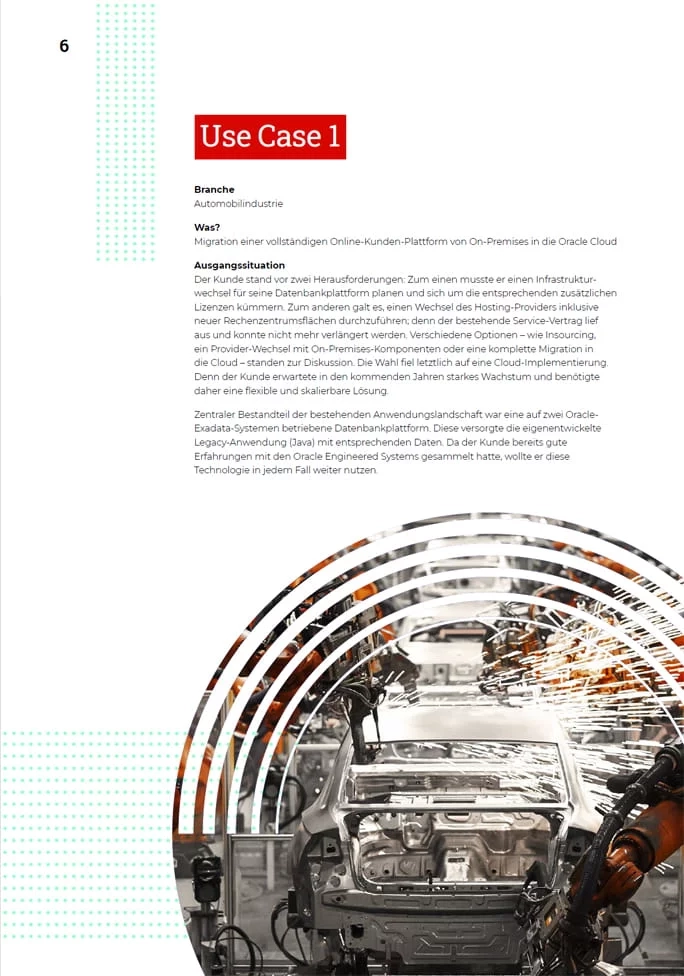 Wollen Unternehmen Ihre On-Premises-Lösungen schnell und risikoarm migrieren, stehen die IT-Abteilungen vor einigen Herausforderungen. Das vorliegende Whitepaper zeigt einen Ausweg aus dem Dilemma: Im Fokus stehen beispielhaft zwei konkrete Database Service Use Cases, die die Benefits der Oracle Cloud Infrastructure – kurz OCI – in Bezug auf die Transformation von I/O-intensiven Enterprise Workloads herausstellen.